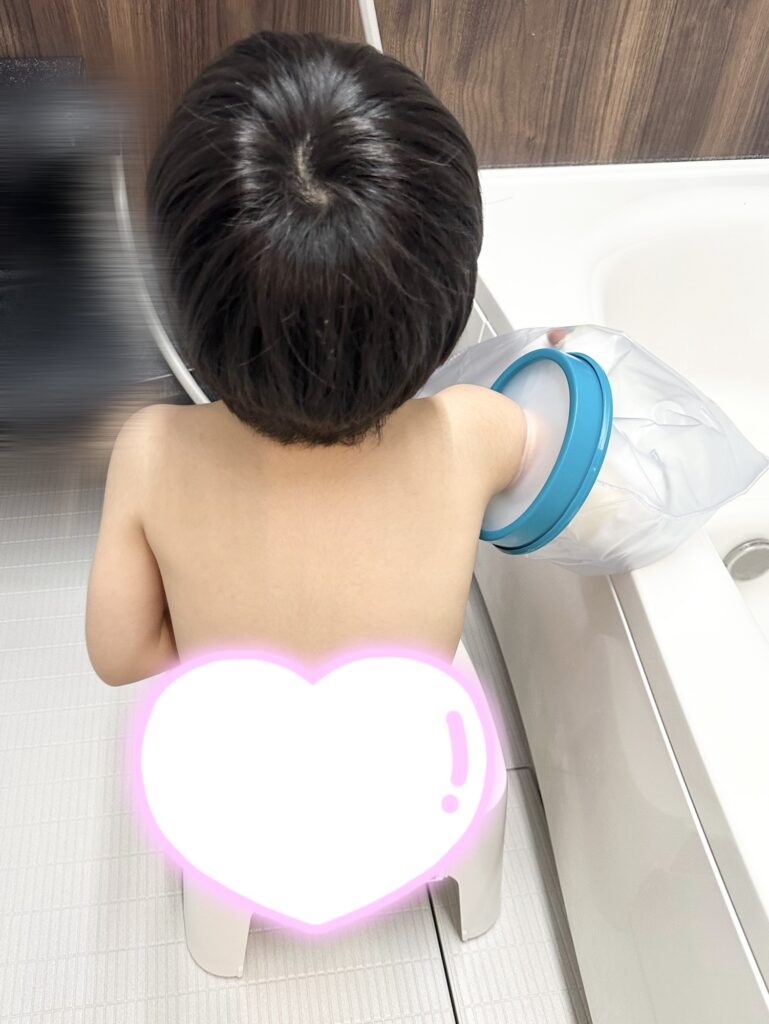 さっそく長男につけて貰ったところ、密着性・密閉性は問題なさそうです。せっかくなので、そのままお風呂場へ連れて行きます。