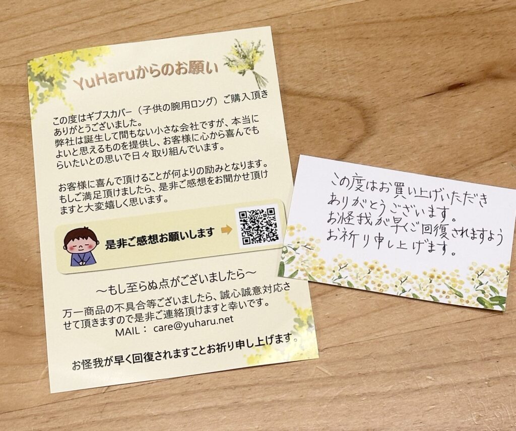 商品は直ぐに届きました。包装は無駄のない感じで、商品・説明書・手書きのメッセージが添えられていました。手書きのメッセージカードって、件数が増えれば増えるほど手間もかかりますし作業も大変だと思います。でも、怪我をした人のことを思って、手書きのメッセージを入れてくれるというのは嬉しいですよね。メーカーの方の優しさや気遣いには、非常に感銘を受けました。心のこもった製品を購入できて良かったです。