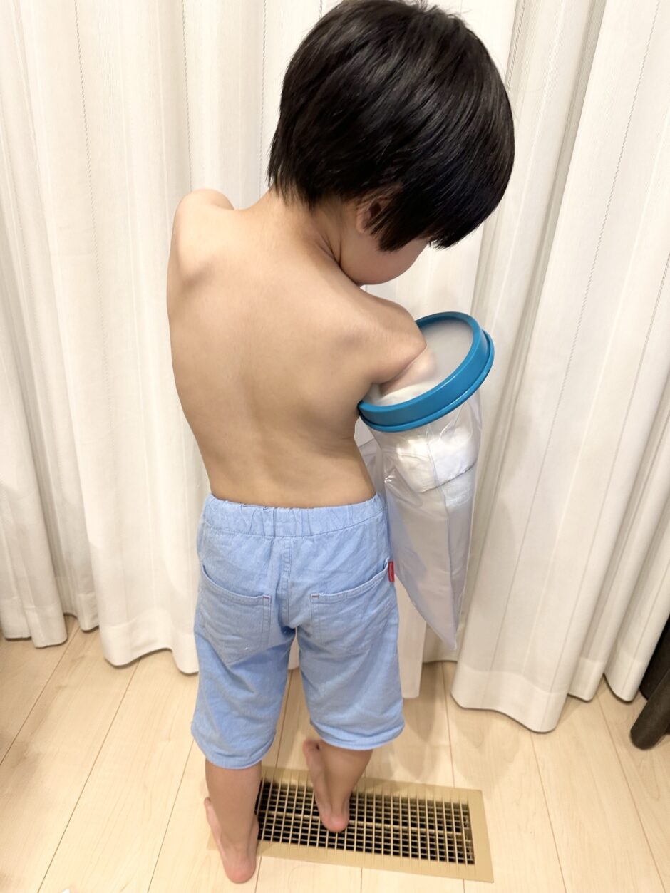 長男にとってはまだギブスは重たいので、防水カバーを着用したままお風呂の縁に腕を置いて貰ってシャワーを浴びてもらいます。頭から身体までしっかり洗っていきましたが、防水カバーの中にお湯が入ることもなく、これならギブスしている期間のお風呂問題は解決できそうと感じました。案の定ギブスが取れるまでの約2ヶ月、問題なく使用できました。よくできた製品だなと改めて思いました。